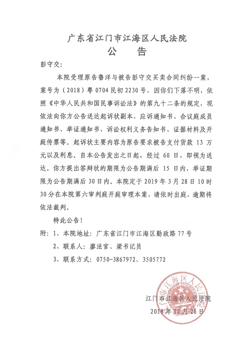 公告(2018粤0704民初2230号)