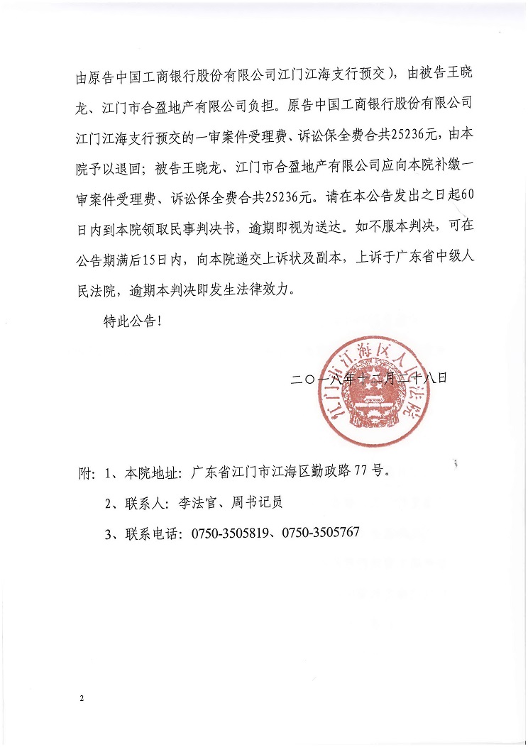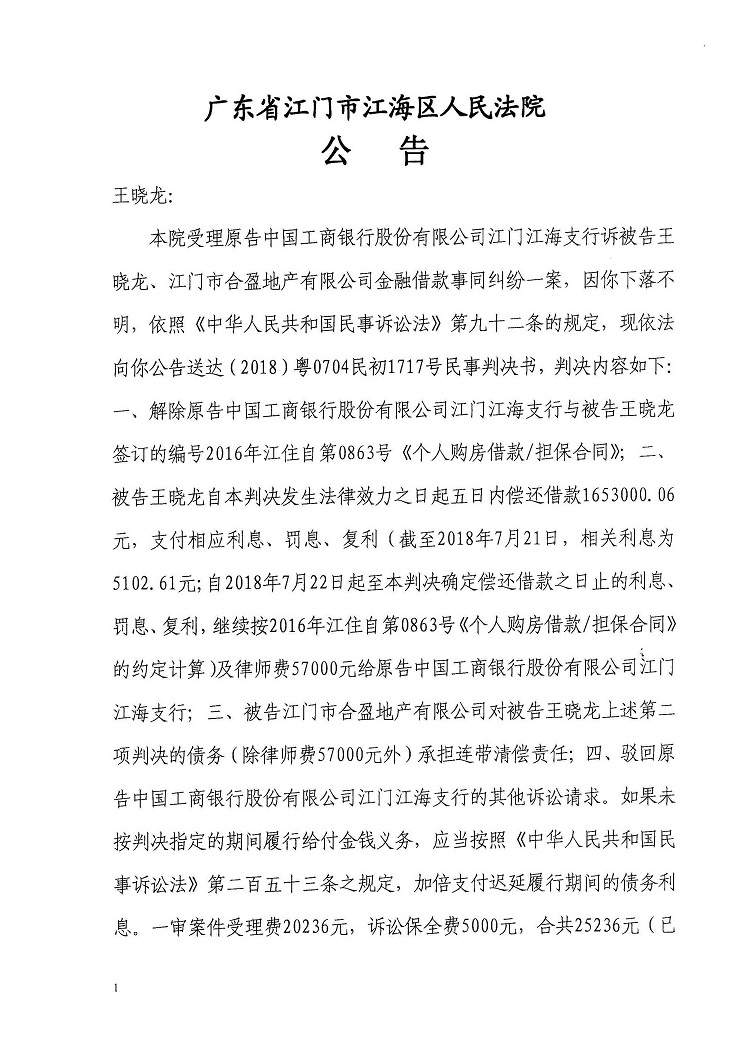 公告(2018粤0704民初1717号)