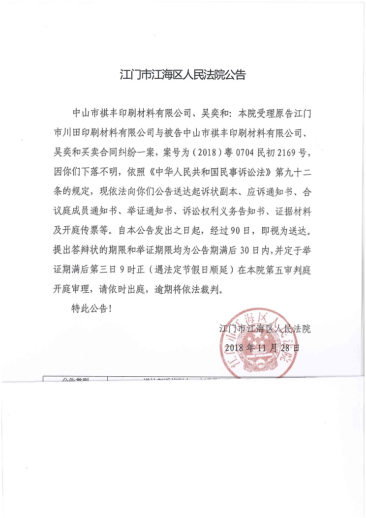 公告(2018粤0704民初2169号)
