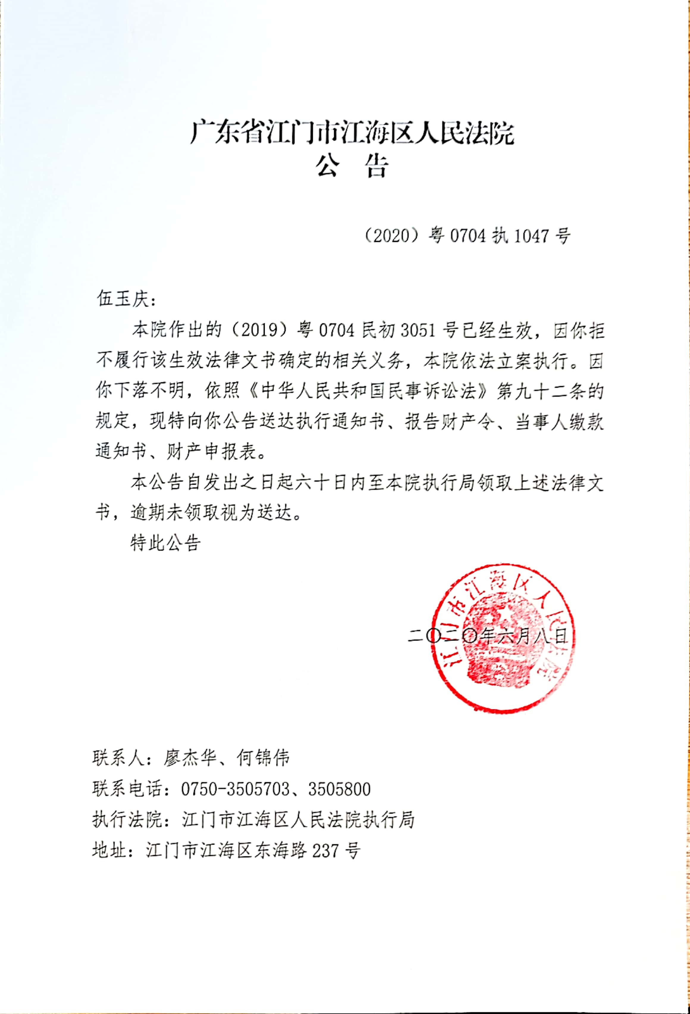 公告(2020粤0704执1047号)