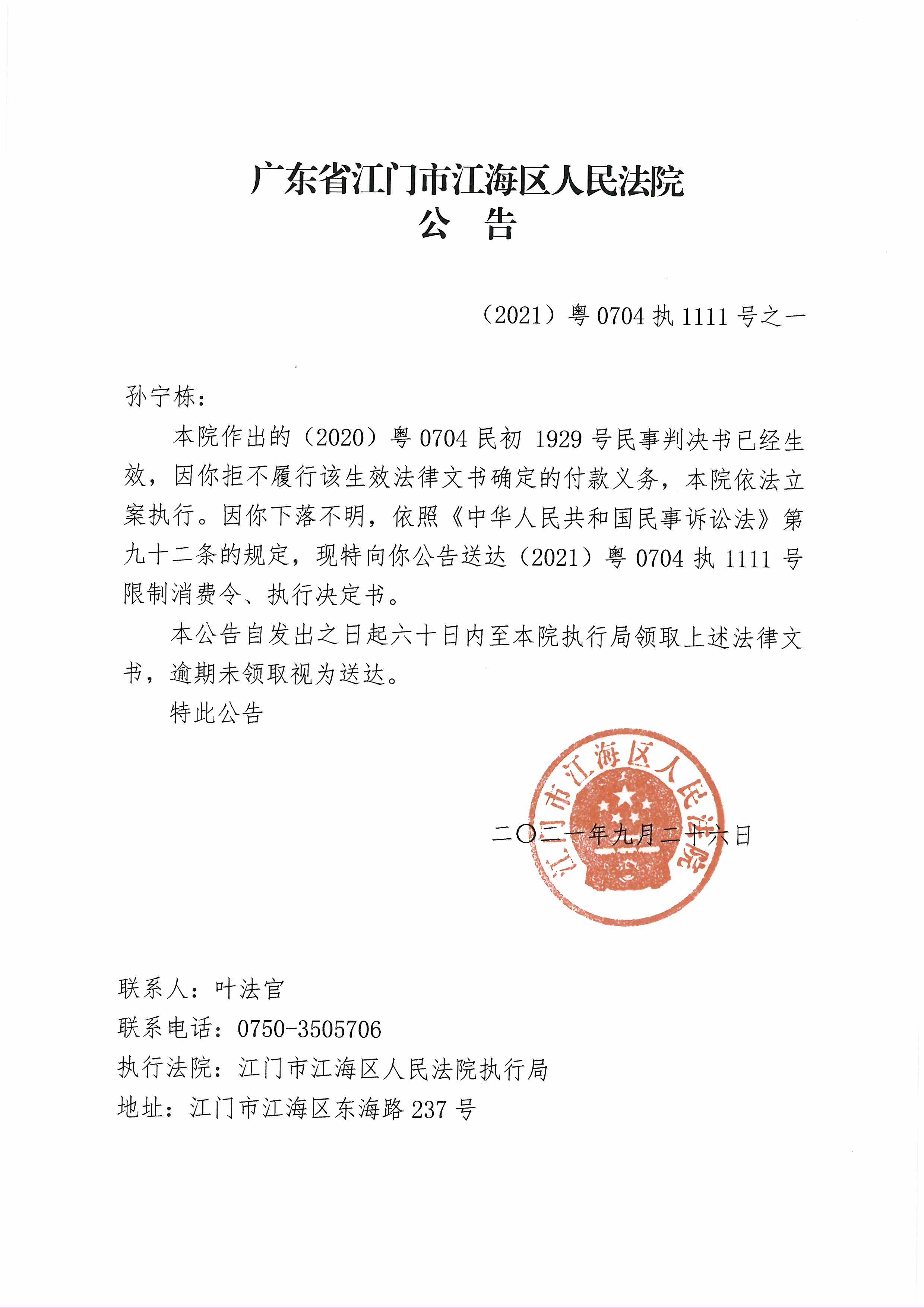 (2021)粤0704执1111号之一