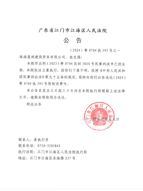 公告(2024)粤0704执595号之一