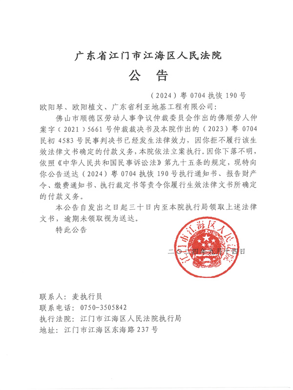 公告(2024)粤0704执恢190号