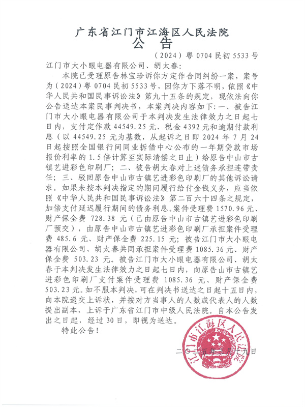 公告(2024)粤0704民初5533号