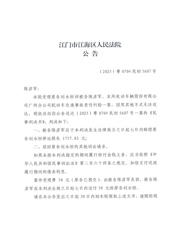 公告(2025)粤0704民初5607号