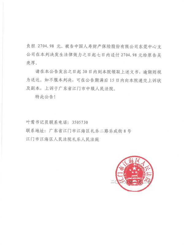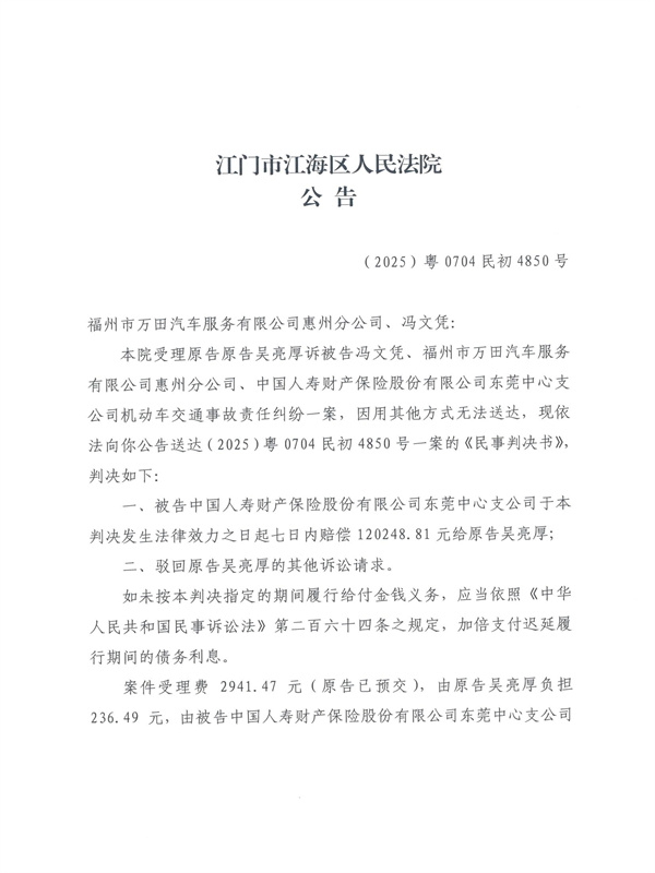 公告(2025)粤0704民初4850号