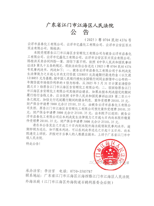 公告(2025)粤0704民初4376号