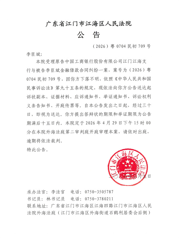 公告(2026)粤0704民初709号