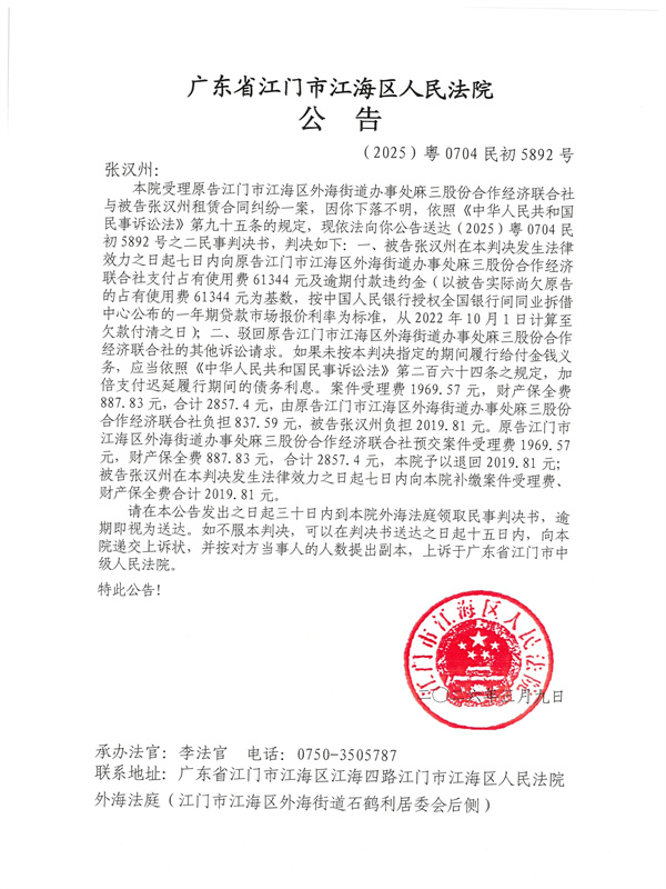 公告(2025)粤0704民初5892号