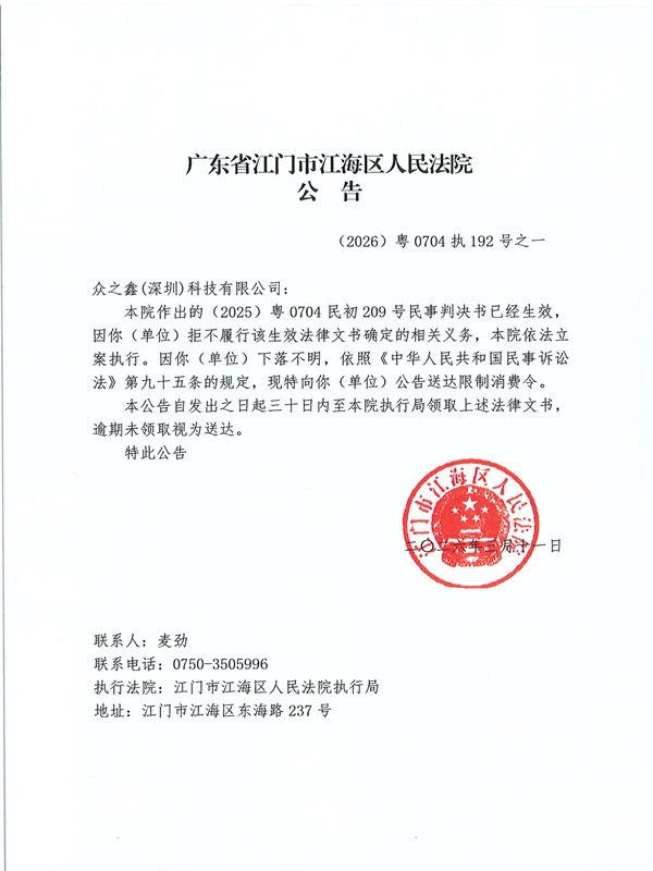 公告(2026)粤0704执192号之一