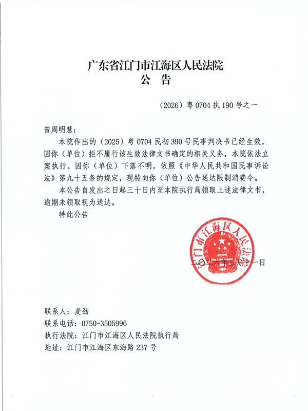 公告(2026)粤0704执190号之一