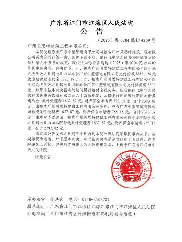 公告(2025)粤0704民初4209号