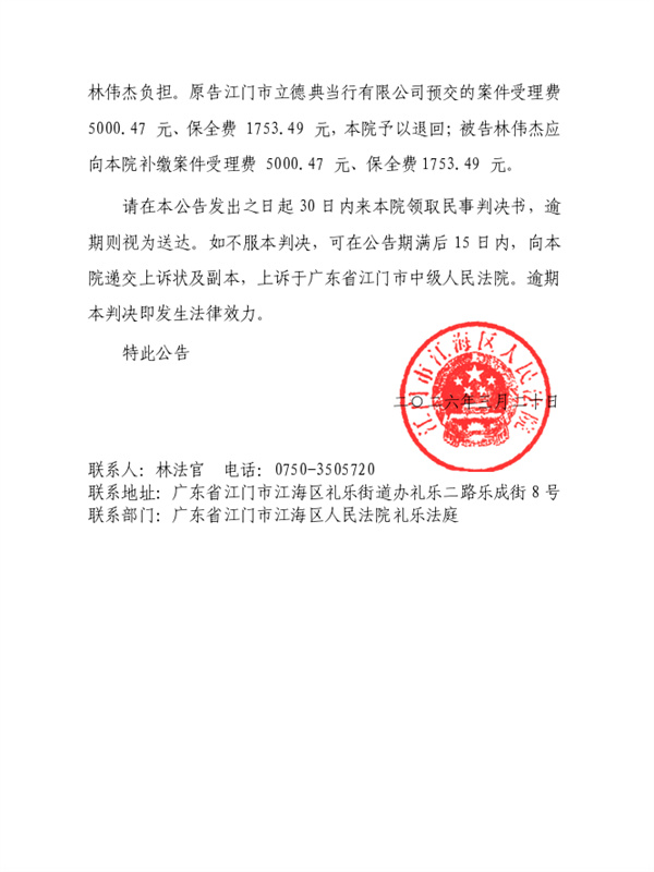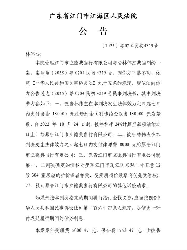 公告(2025)粤0704民初4319号