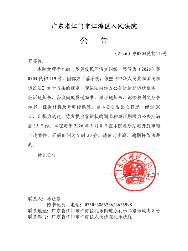公告(2026)粤0704民初119号