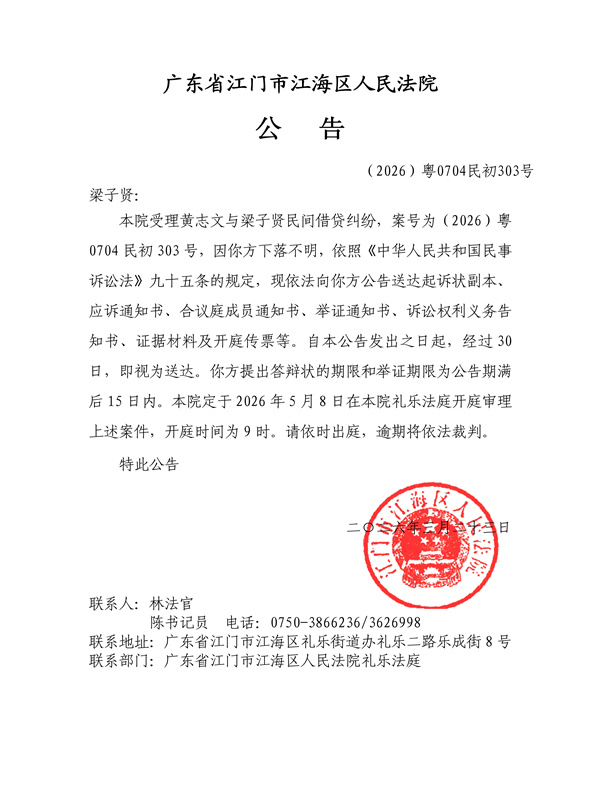 公告(2026)粤0704民初303号