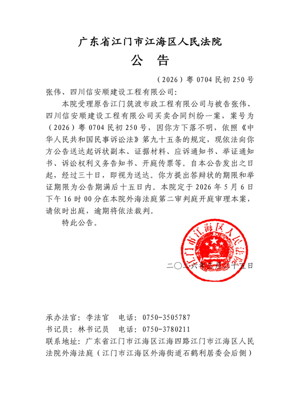 公告(2026)粤0704民初250号