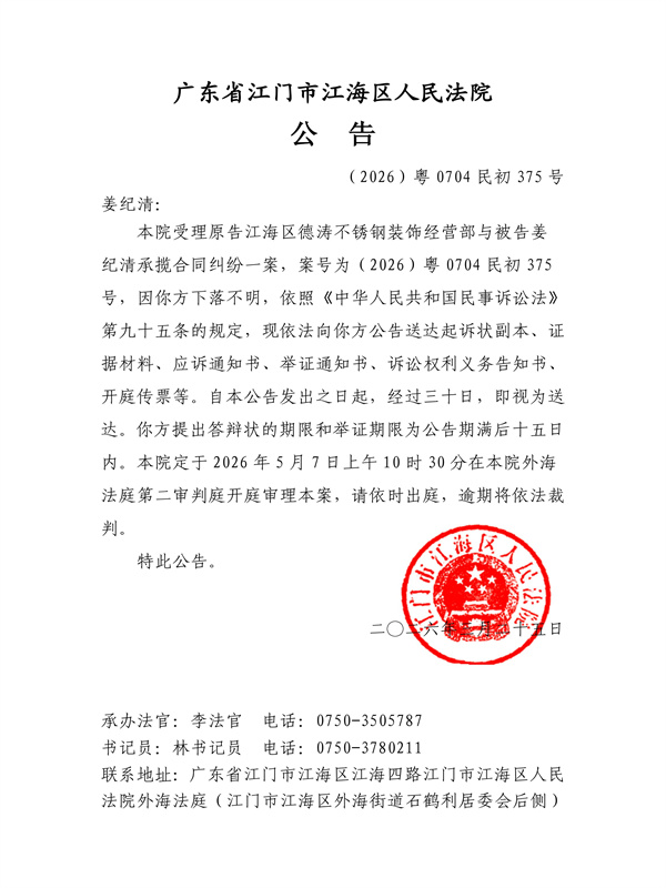 公告(2026)粤0704民初375号