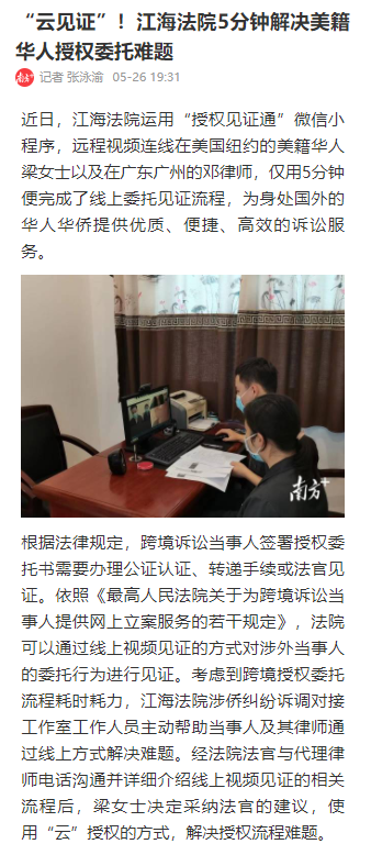 近日,江海法院运用“授权见证通”微信小程序,远程视频连线在美国纽约的美籍华人梁女士以及在广东广州的邓律师,仅用5分钟便完成了线上委托见证流程,为身处国外的华人华侨提供优质、便捷、高效的诉讼服务。