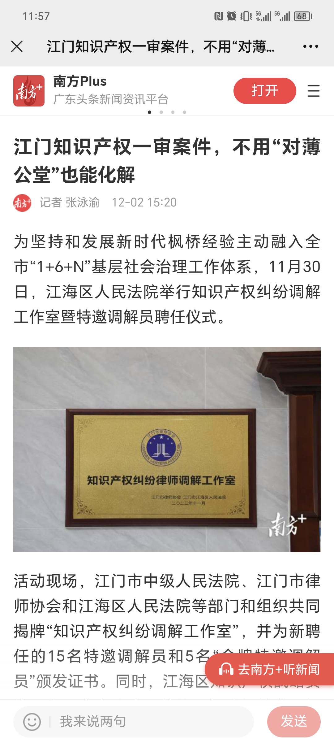 为坚持和发展新时代枫桥经验主动融入全市“1+6+N”基层社会治理工作体系,11月30日,江海区人民法院举行知识产权纠纷调解工作室暨特邀调解员聘任仪式。